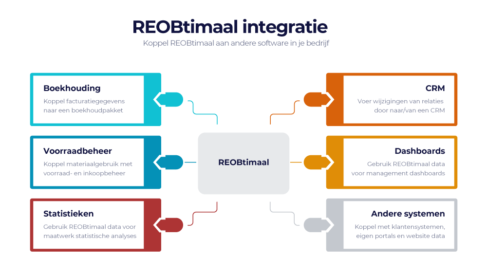 REOBtimaal biedt beschermde mogelijkheden om gegevens uit te wisselen met andere systemen of gegevens binnen REOBtimaal aan te passen door middel van een API (Application Programming Interface).