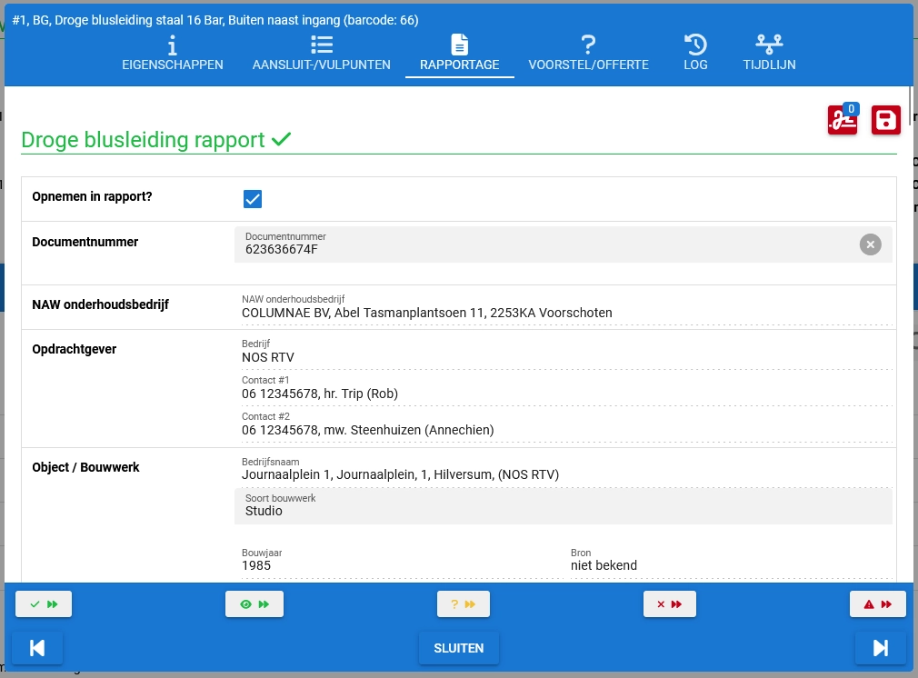 Het beproevingsrapport wordt automatisch in het onderhoudsrapport opgenomen, samen met de bevindingen (per leiding en per aansluitpunt).