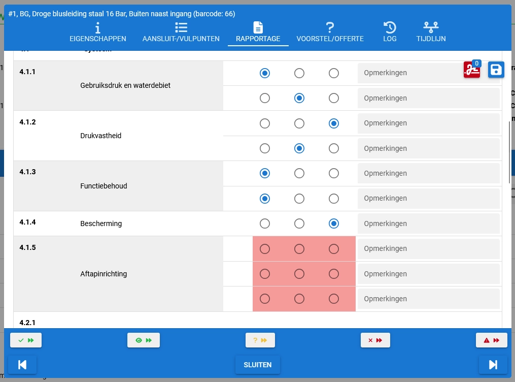 Per blusleiding en per aansluitpunt kun je bevindingen registreren zoals aanwezigheid van een ketting, picto en deksel.